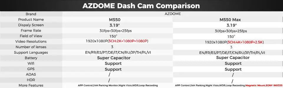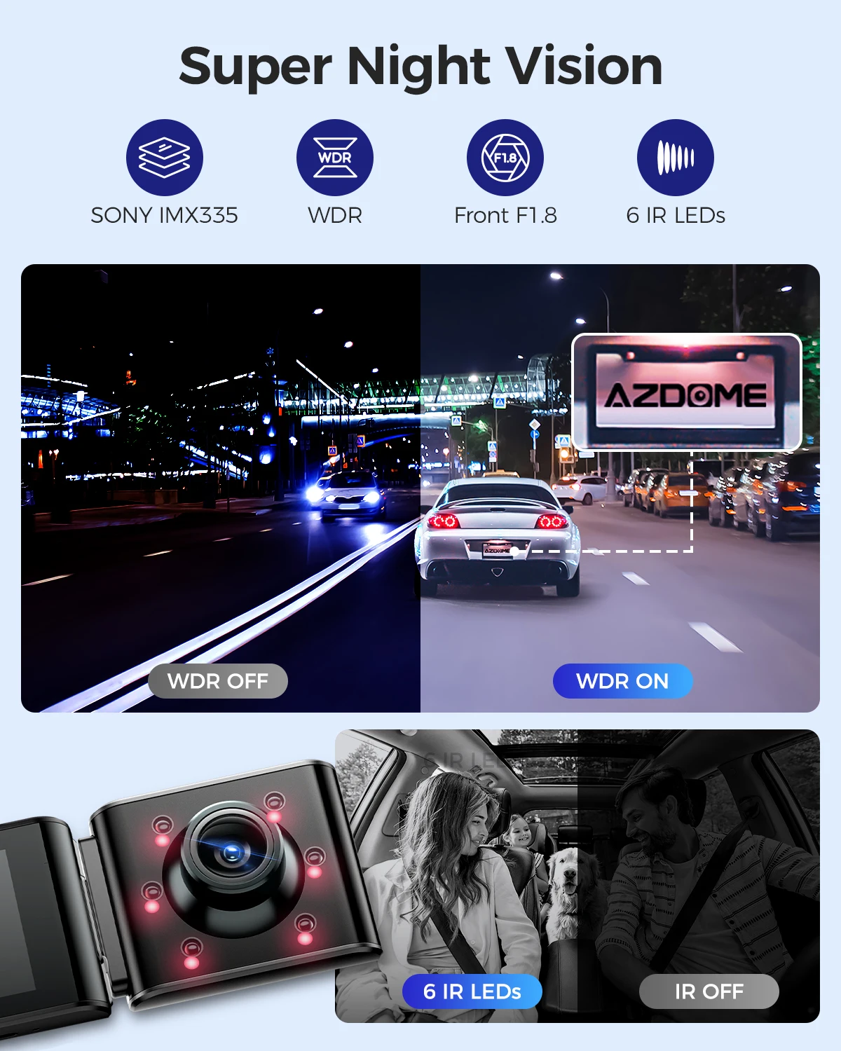 AZDOME M550 MAX dashcam delivers super night vision. Dash cam backs with Novatek NT96670 Processor, GC4653, the Sony IMX307 and GC2053 sensor. Night vision dash cam could clearly record day and night evironment.