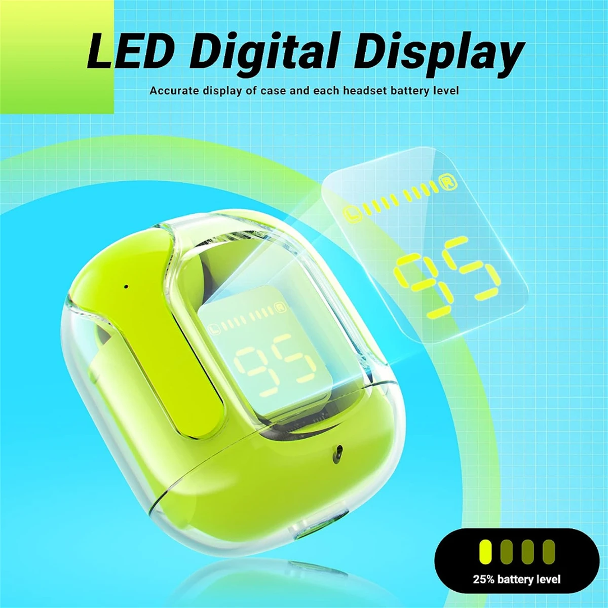 5. [LED Digital Display and Colorful Design] The accurate LED display of the charging case and the two earphones allows you to know the power status of the wireless earphones and the charging case at any time. This series of Bluetooth headsets uses a futuristic translucent charging box with a total of 5 colors. These waterproof earplugs can effectively prevent splash damage caused by sweat and rain.
