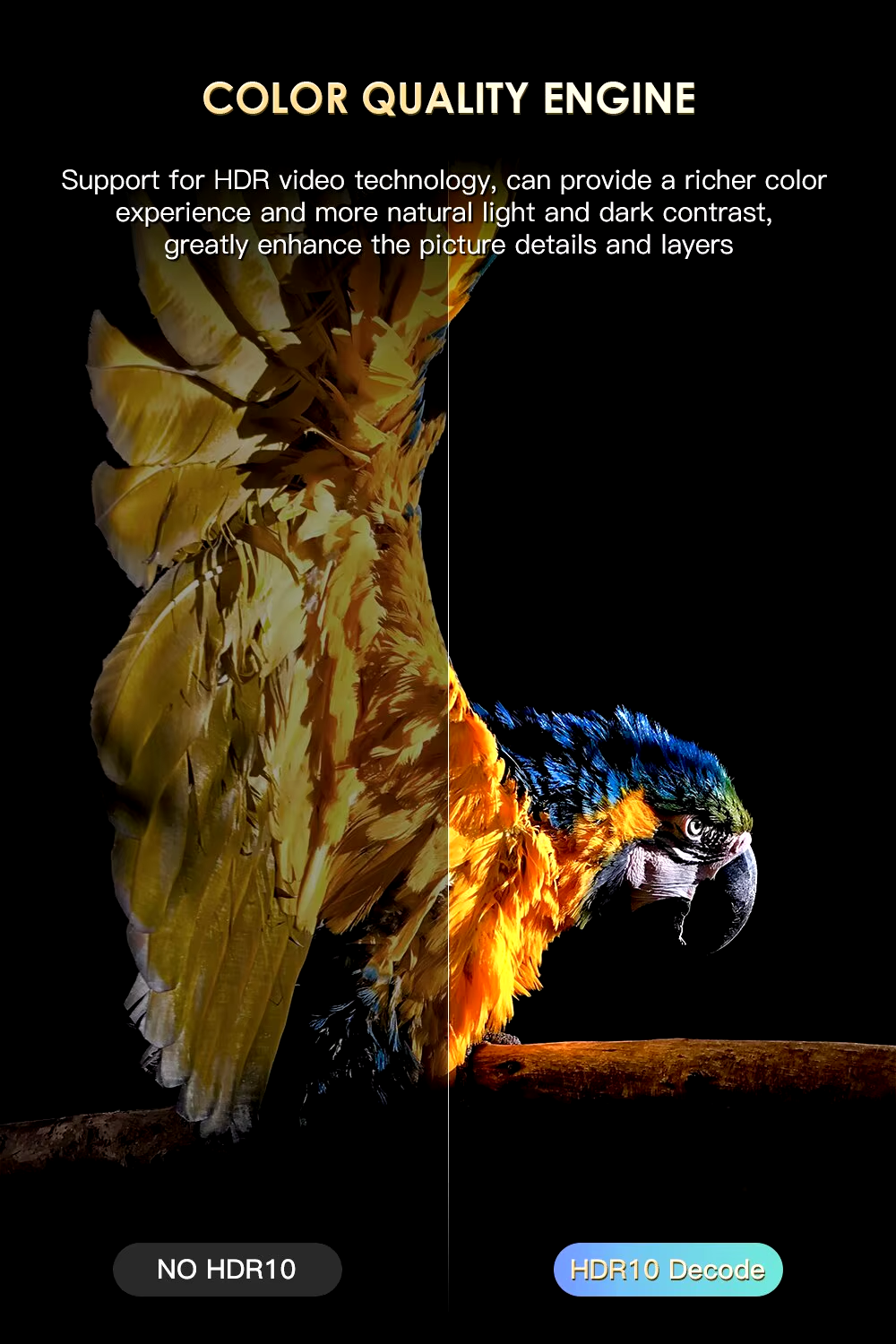 Support for HDR video technology, can provide a richer color experience and more natural light and dark contrast,greatly enhance the picture details and layers